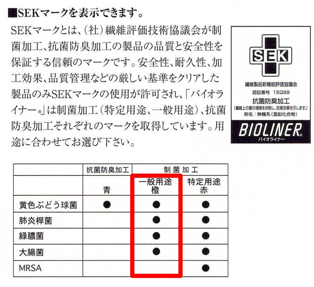 制菌・抗菌商品の品質・安全性保証「SEKマーク」を取得した「バイオライナー」の強力な抗菌の“制菌加工”(一般用途)レベルを使用しています。