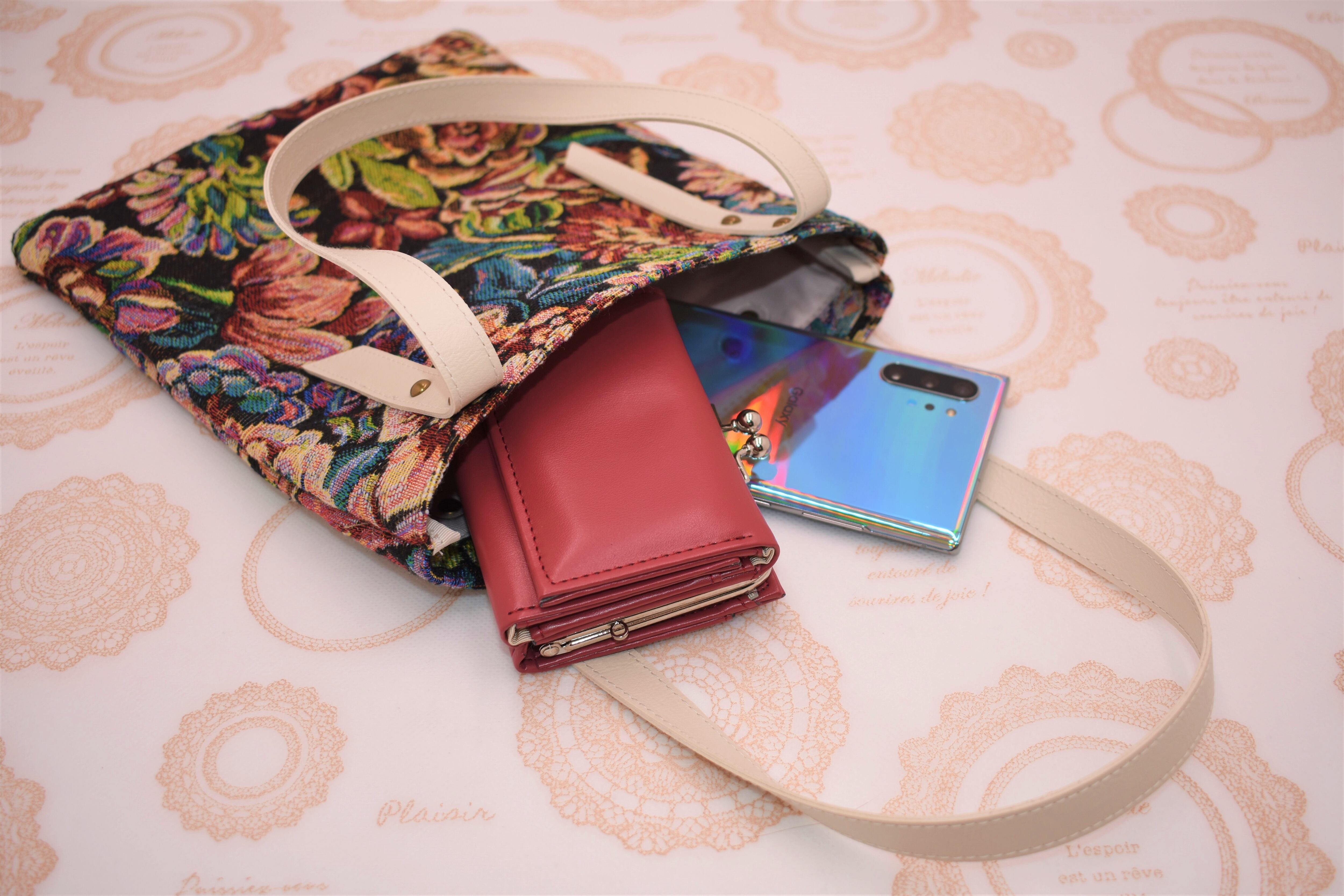 コンビニや近所のスーパーへお買い物行く時に便利なスマホや財布にエコバッグを入れるぐらいの可愛いサイズのトートバッグ。
