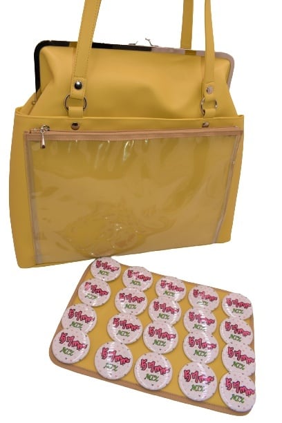 表面は電車やバスに乗っても安心の普通の鞄! 裏面は推しを盛大にアピール出来る鞄♡♡ 缶バッジを装着しやすいように装着部分を取り出せる仕様となっております。 (写真では57㎜の缶バッジ装着例と76㎜の缶バッジ装着例です)