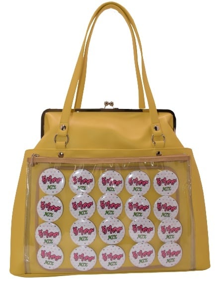 表面は電車やバスに乗っても安心の普通の鞄! 裏面は推しを盛大にアピール出来る鞄♡♡ 缶バッジを装着しやすいように装着部分を取り出せる仕様となっております。 (写真では57㎜の缶バッジ装着例と76㎜の缶バッジ装着例です)